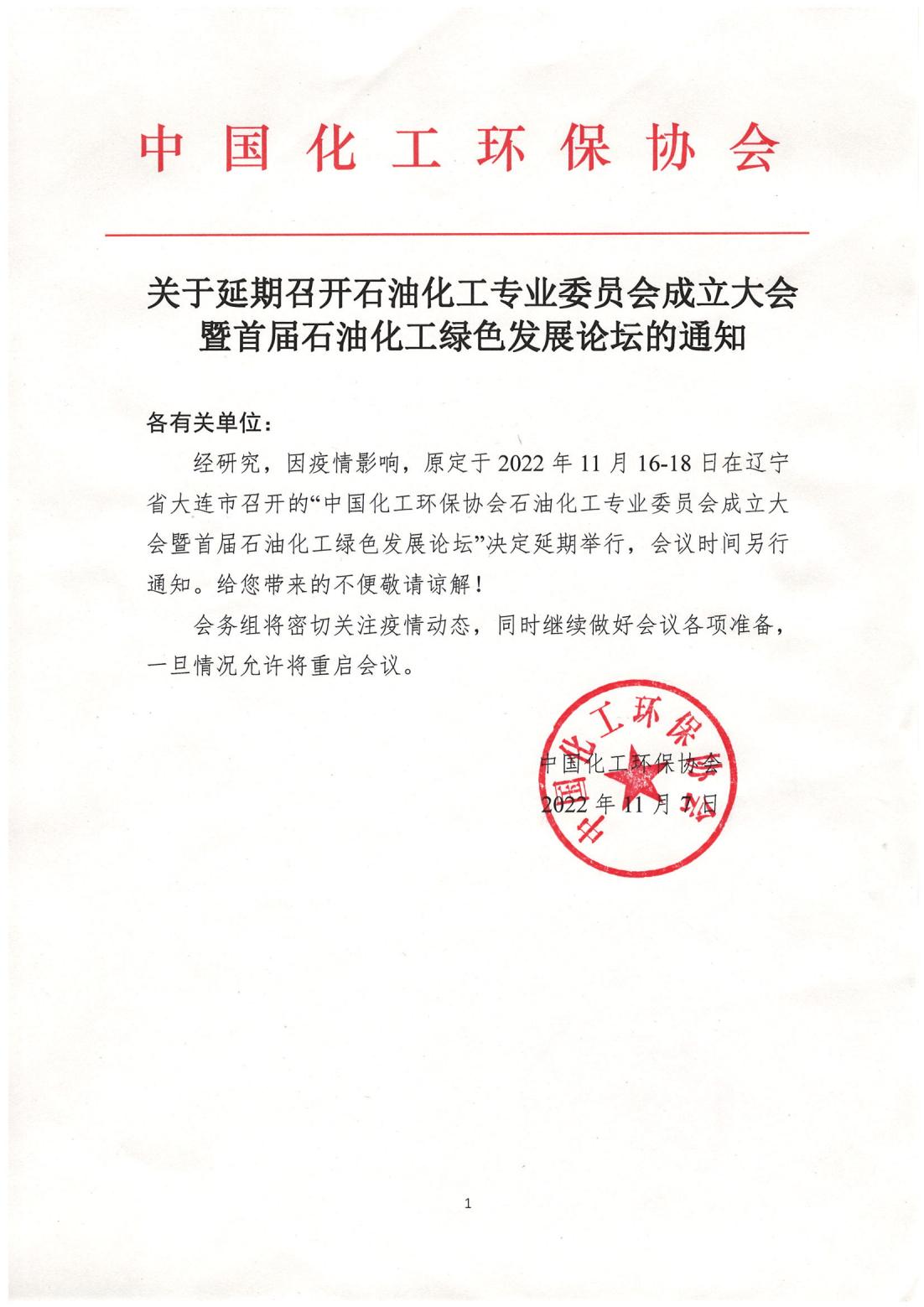 经研究,因疫情影响,原定于2022年11月16-18日在辽宁省大连市召开的“中国化工环保协会石油化工专业委员会成立大会暨首届石油化工绿色发展论坛”决定延期举行,会议时间另行通知。给您带来的不便敬请谅解!
