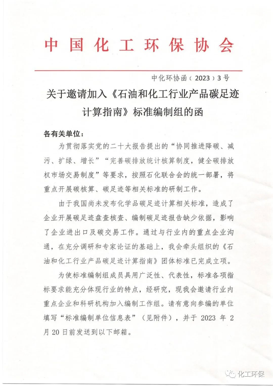 关于邀请加入《石油和化工行业产品碳足迹计算指南》标准编制组的函