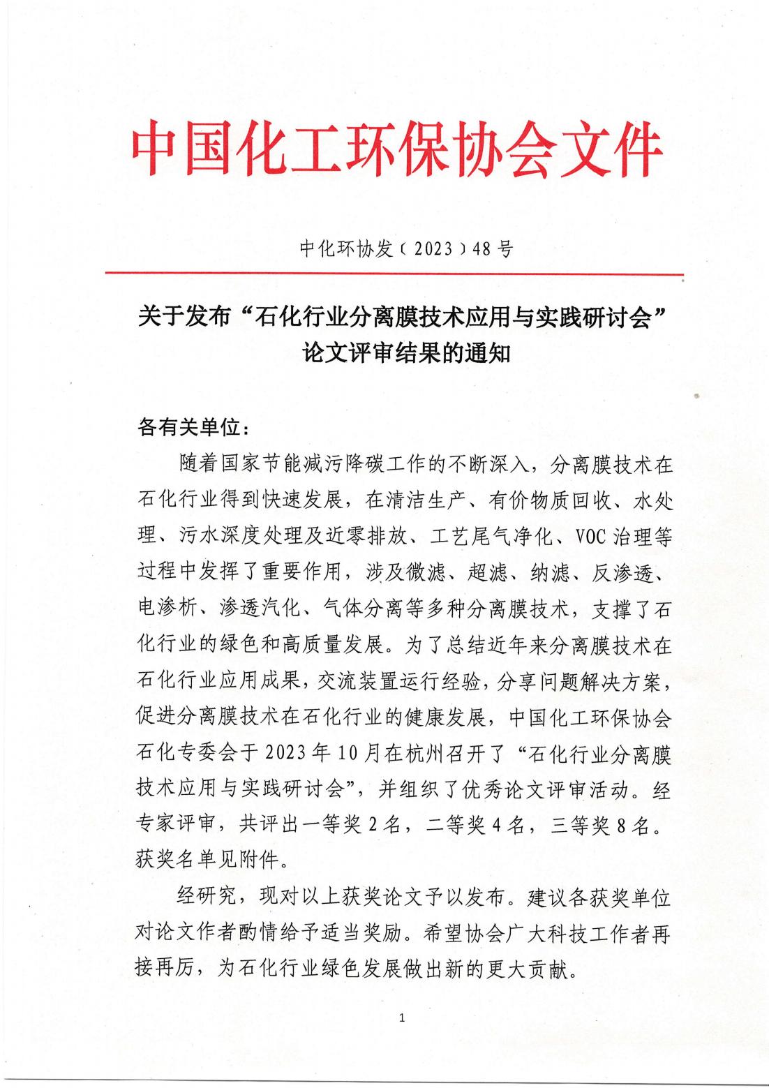 随着国家节能减污降碳工作的不断深入,分离膜技术在石化行业得到快速发展,在清洁生产、有价物质回收、水处理、污水深度处理及近零排放、工艺尾气净化、VOC治理等过程中发挥了重要作用,涉及微滤、超滤、纳滤、反渗透、电渗析、渗透汽化、气体分离等多种分离膜技术,支撑了石化行业的绿色和高质量发展。为了总结近年来分离膜技术在石化行业应用成果,交流装置运行经验,分享问题解决方案,促进分离膜技术在石化行业的健康发展,中国化工环保协会石化专委会于2023年10月在杭州召开了“石化行业分离膜技术应用与实践研讨会”,并组织了优秀论文评审活动。经专家评审,共评出一等奖2名,二等奖4名,三等奖8名。获奖名单见附件。