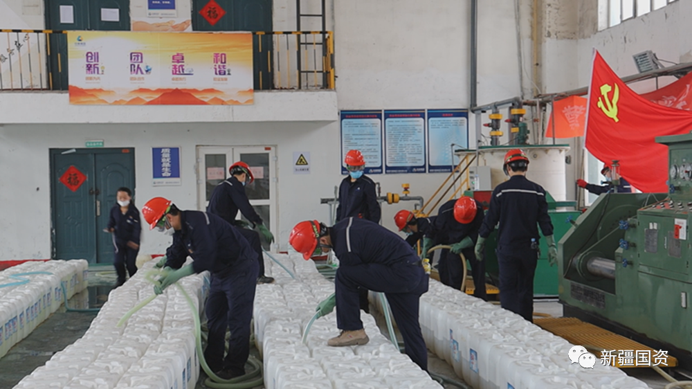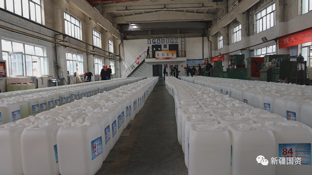 目前,中泰集团华泰公司84消毒品原液生产厂房里,一排排灌装桶整齐的摆放,公司干部员工正在进行紧张有序的灌装工作,一排排84消毒液快速罐装完毕,并在第一时间装车辆运往乌鲁木齐各区县。