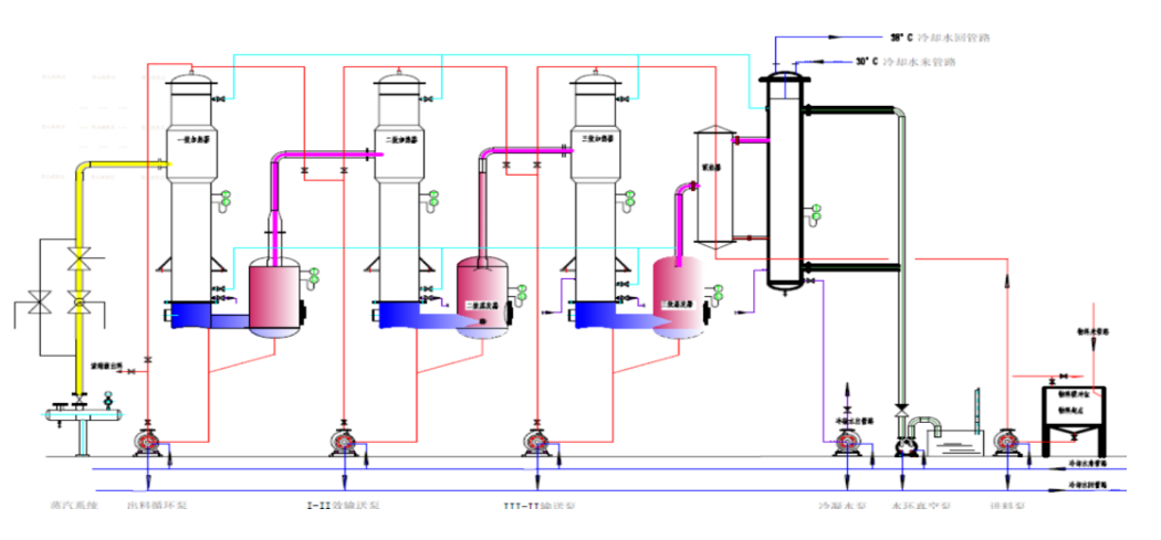 三效蒸发系统采用混流蒸发,是在第一效蒸发的过程中需要外界输入蒸汽,利用蒸发过程中产生的二次蒸汽为后端效加热,三次利用蒸汽从而达到节约蒸汽的目的。