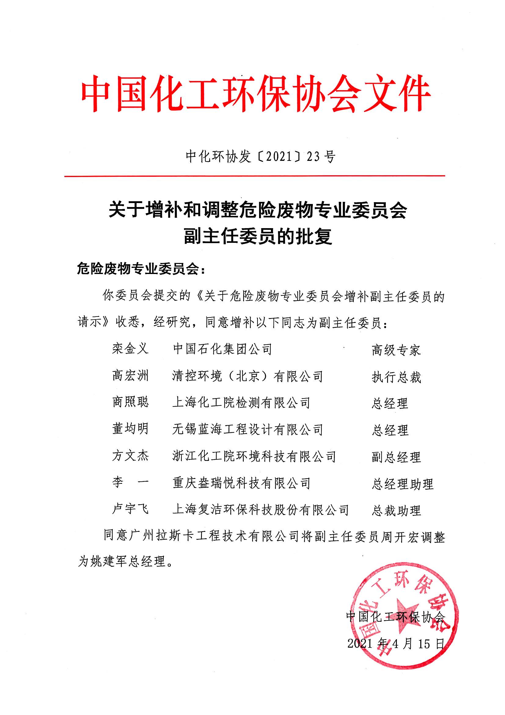 关于增补和调整危险废物专业委员会副主任委员的批复
