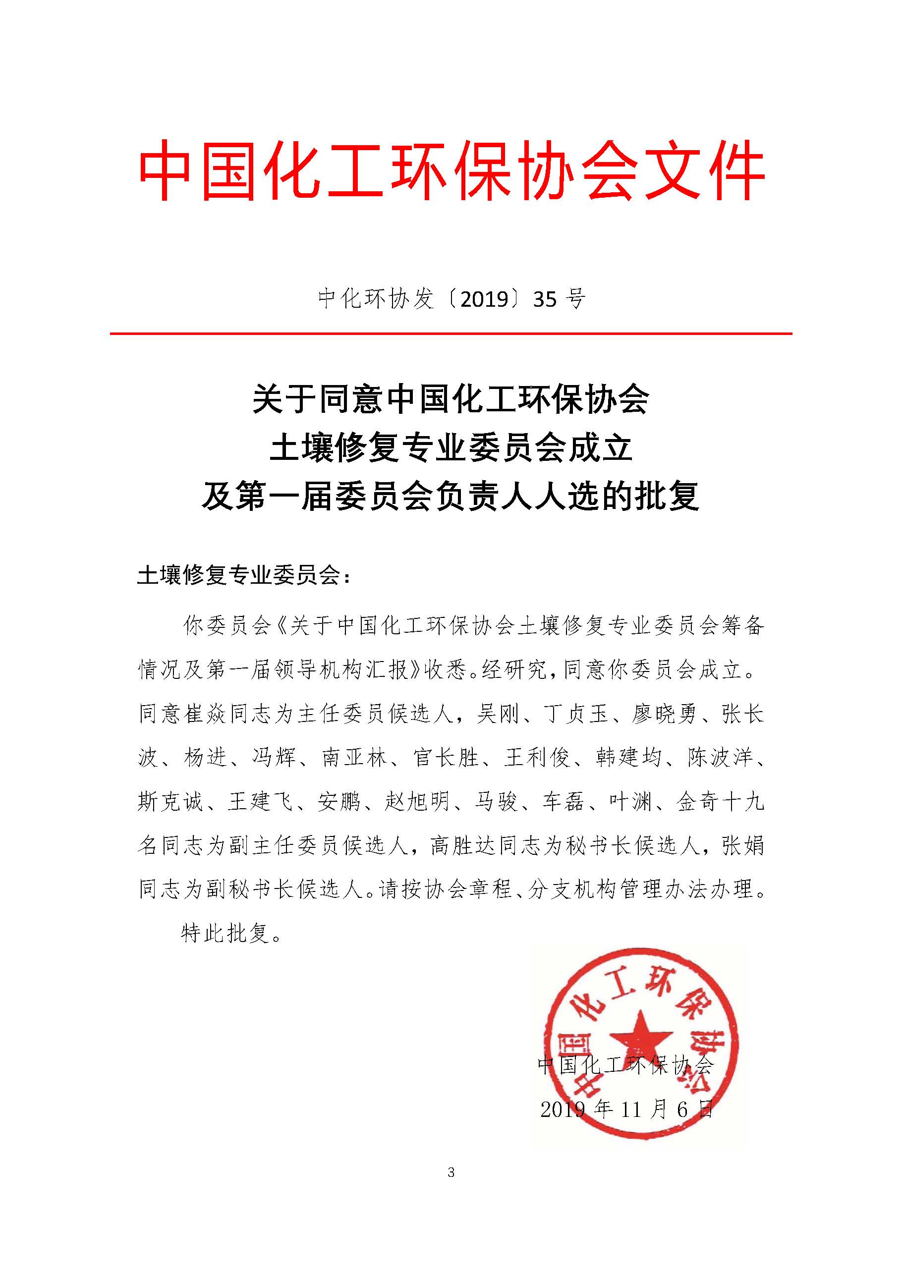 关于同意中国化工环保协会土壤修复专业委员会及第一届负责人人选的批复